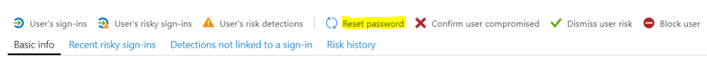 If the user is not registered for MFA or SSPR by the new security information experience then a user hit the score high-risk user their is not able to sign-in before the password is changed from the Azure AD portal. So configure this setting so all users is registered to change their own password. Before to push this settings it can be a good idea to share this link to all users and register them before the got required to do that.