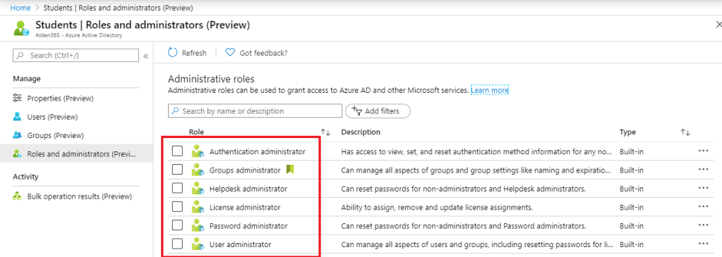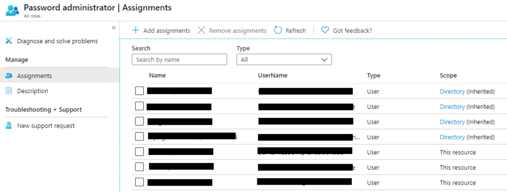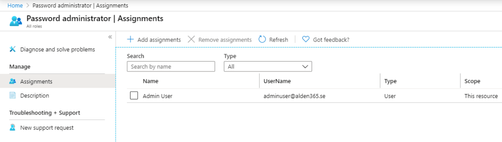 Another thing with the interface is the confusing around assignment of administrative users. In the picture below we have Password administrators but they with the scope “Directory (Inherited)” is not member of the AU. Only the users with scope “This resource”. If an user have Directory (Inherited) then the admin user is assigned directly to the admin role in Azure AD and not limited to this scope. This is a bit confusing and not clear.