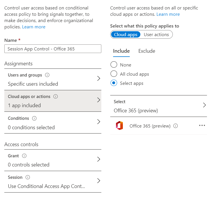 Step one is to create a Conditional Access rule. Scope the user and select which application we will apply this function on. In the post I cover the Office 365 preview application that include Mailbox, OneDrive, Teams and SharePoint.