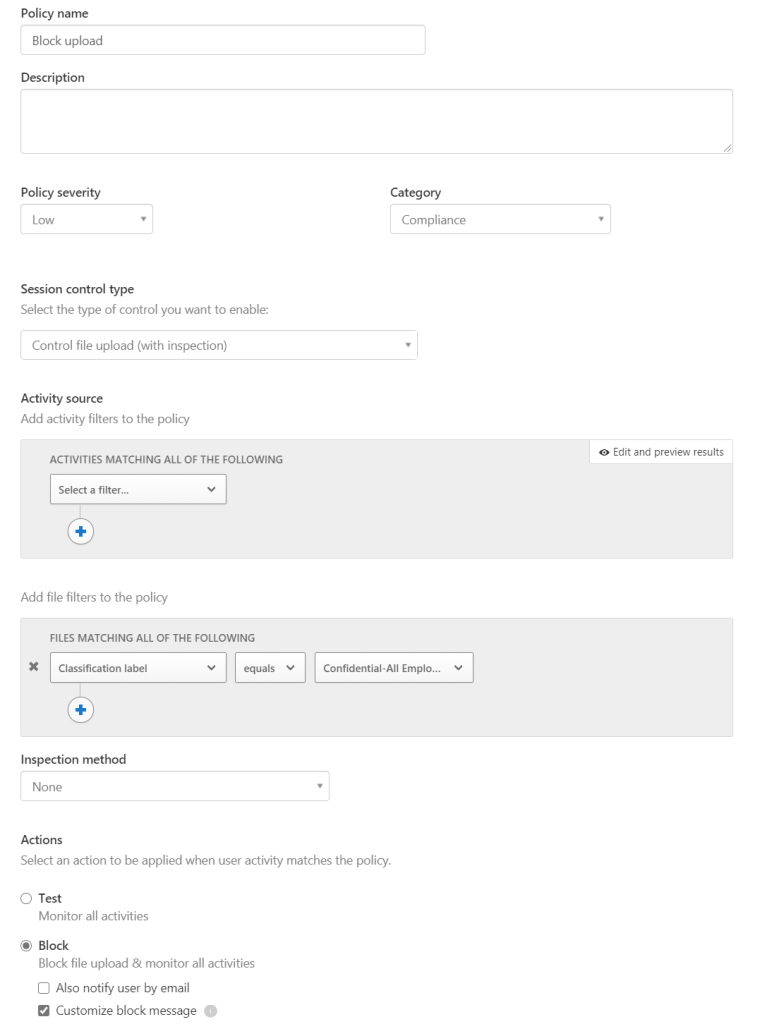 Name the policy “Block upload of confidential data”. Set the category to compliance. Remove all filter under Activity source and add your own filter. Classification label equals Confidential (Label name). Select Block and enabled “Customize block message”.