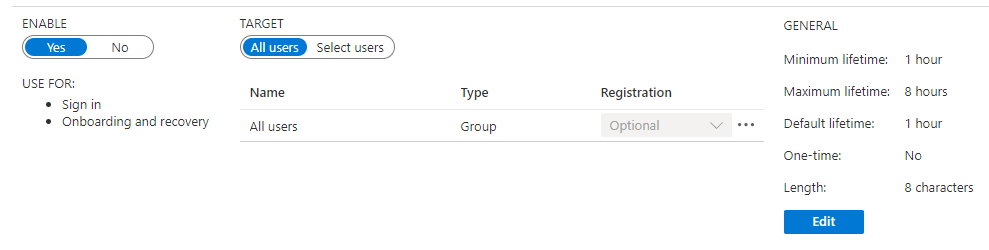 Begin to create a TAP policy in Azure AD portal. Enabled the Temporary Access Pass (preview) by select the target to All users or a group of users to pilot the function. There are also a setting to configure the lifetime.