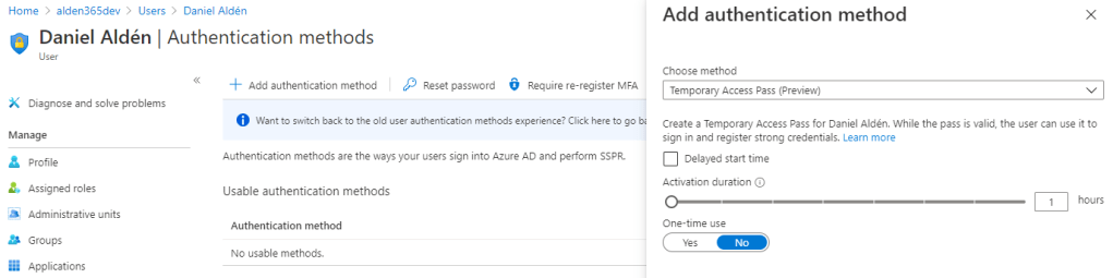 Ensure that you enable the “new user authentication methods experience“. Add authentication method. Select Temporary Access Pass (preview) and select for how long time the user activation is enabled. The “Activation duration” depends on which lifetime settings where made earlier.
