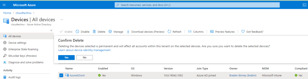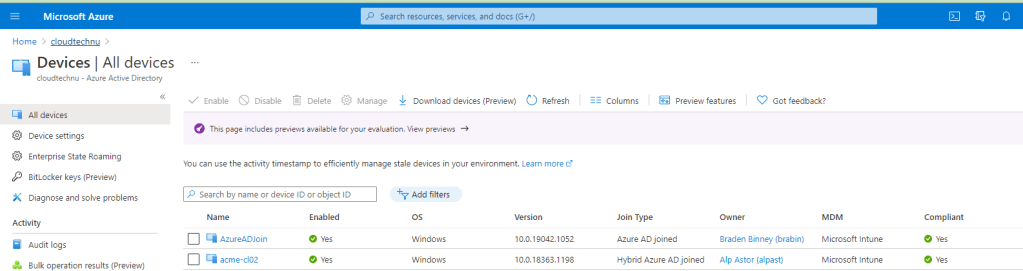 We can also see that we have a machine joined under Devices and also managed by Intune since I configured Azure AD managed machines should be handled by Intune.