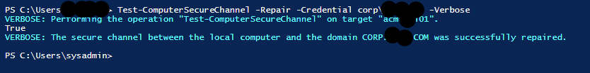 Test-computerSecureChannel -Repair -Credential domain\domainadmin -Verbose